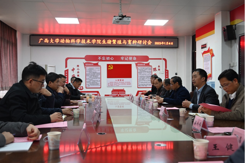 2023年1月4日,新年伊始,在动科院302会议室举办了“2022生物资源保护与利用国际产学研用合作会议”的主题研讨会“生猪繁殖与育种研讨会”。参加研讨会人员有动科院领导陆阳清常务副院长、何家康副院长、韦祖樟副院长及骨干教师,河南守望之境科技有限公司创始人刘洪波博士,区内养猪企业育种主要负责人赵云翔、司景磊、何昭友等,大家围绕生猪繁殖与育种主题,分别从繁殖育种、饲料营养、疫病防控、生产管理角度展开了热烈讨论。