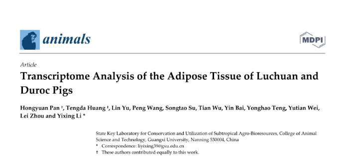 近日,威廉官网中国官方网站动物科学专业2019级本科生潘鸿远在SCI期刊《animals》 (JCR一区,中国科学院二区)以第一作者发表题为“Transcriptome Analysis of the Adipose Tissue of Luchuan and Duroc Pigs”的研究论文。该论文通讯作者为威廉官网中国官方网站李一星副研究员,作者还包括白银、滕永昊、韦宇天等动物科学专业本科生。该研究受到自治区大学生创新创业训练项目以及威廉官网中国官方网站大创项目倍增计划重点项目的支持。