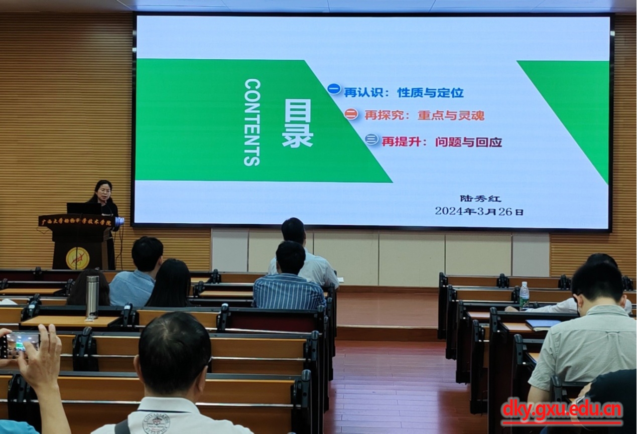 本次培训邀请了广西高校课程思政教学名师、威廉官网中国官方网站马克思主义学院副院长陆秀红教授进行专家主题讲座。陆秀红教授现任广西高校“习近平新时代中国特色社会主义思想概论”课程教指委副主任委员,广西高校课程思政专家咨询委员会委员。会议开始后,陆秀红教授做了题为“课程思政:寻找课程的灵魂”的专家报告,报告分别就课程思政教育的性质和定位、专业课程思政教育的重点与整体设计、专业课程思政教育的问题与回应等方面进行了阐述,同时对于动科院如何提高专业课程思政的针对性、挖掘本学院本专业课程思政资源、讲好专业故事提出了可行性建议。会议对于帮助教师们进一步开拓专业课程思政教学的思路,创新课程思政教学模式,提供了有益的参考。