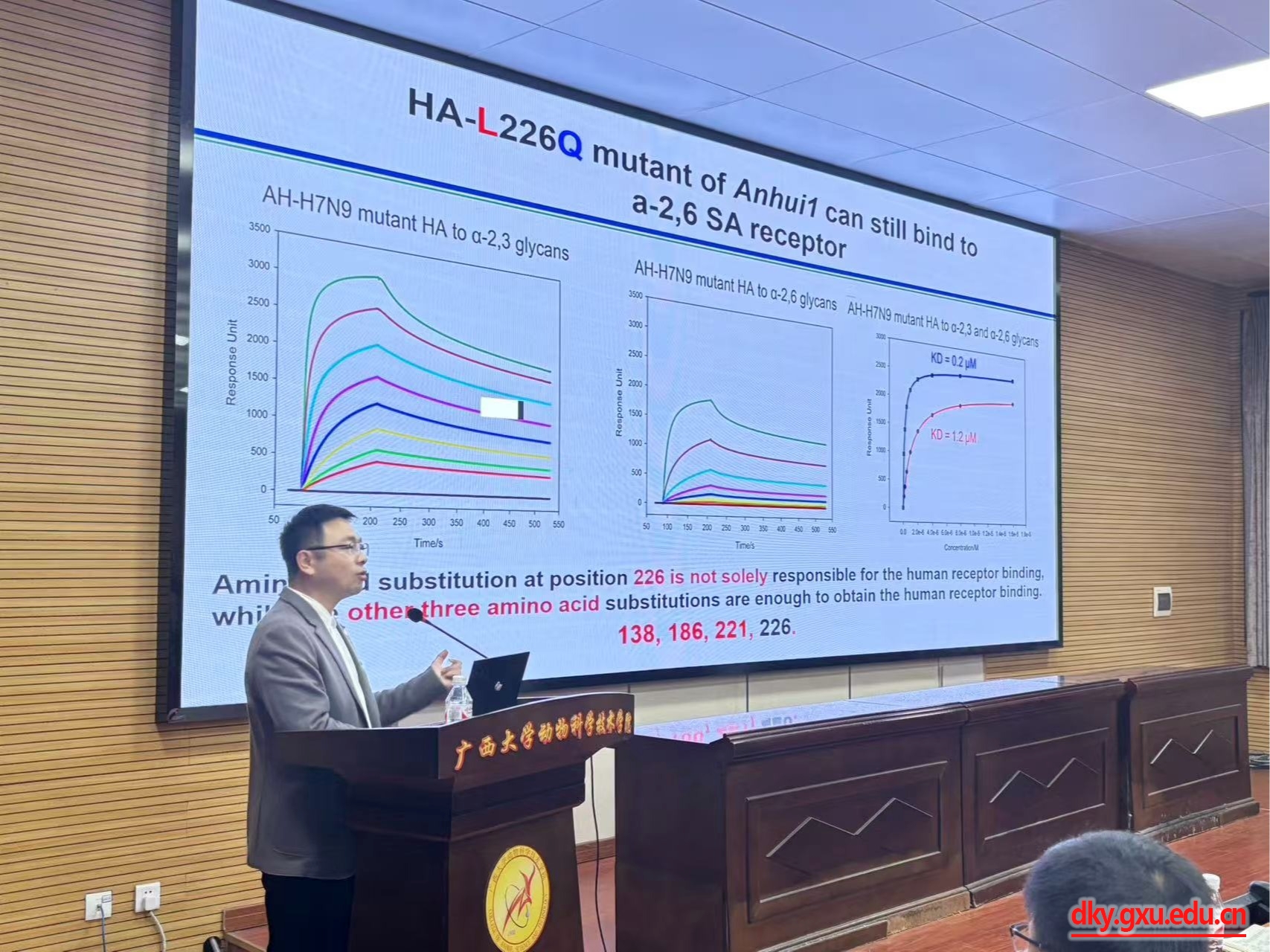 12月20日上午,中国科学院微生物研究所毕玉海研究员受广西大学威廉官网中国官方网站的邀请在学院318报告厅作题为“禽流感病毒的跨种传播机制与高风险病毒预警”的学术报告。威廉官网中国官方网站陆阳清院长、罗廷荣教授、陈樱教授等教师以及200多名师生参加报告会。报告会由威廉官网中国官方网站副院长何家康教授主持。