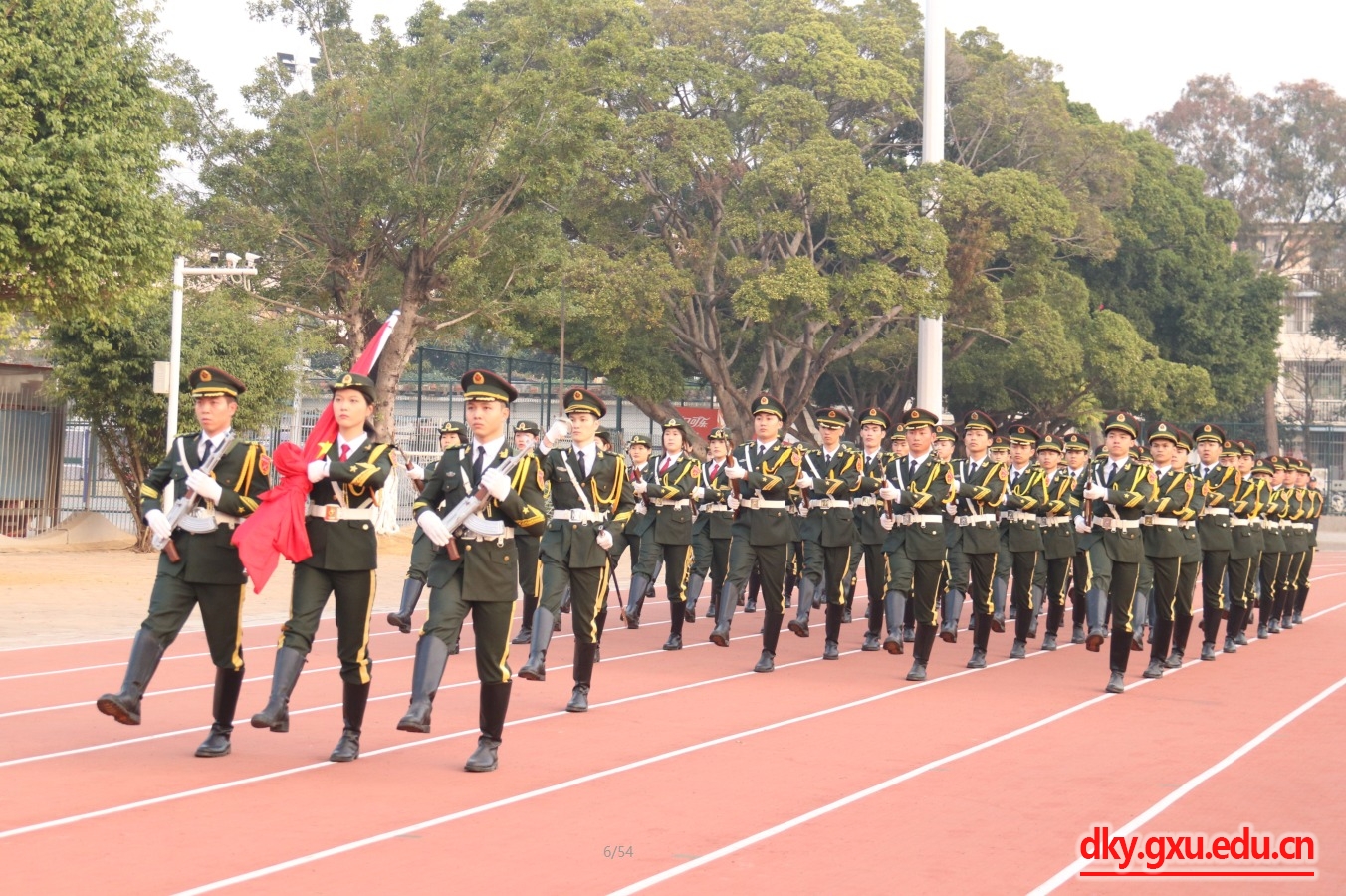 在全场师生的注目下,英姿飒爽的国旗护卫队队员,迈着整齐划一、铿锵有力的步伐,护送鲜艳的五星红旗进场。“起来,不愿做奴隶的人们,把我们的血肉,筑成我们新的长城……”全场师生齐声高唱国歌,注视着鲜艳的五星红旗冉冉升起。