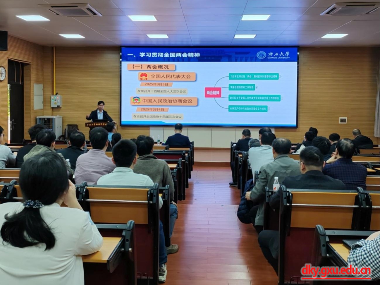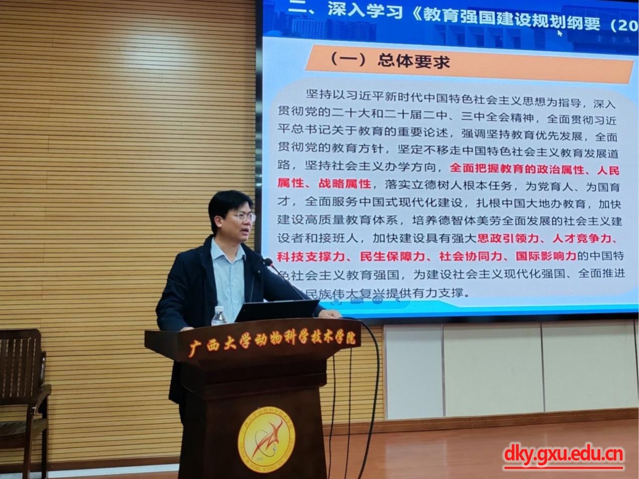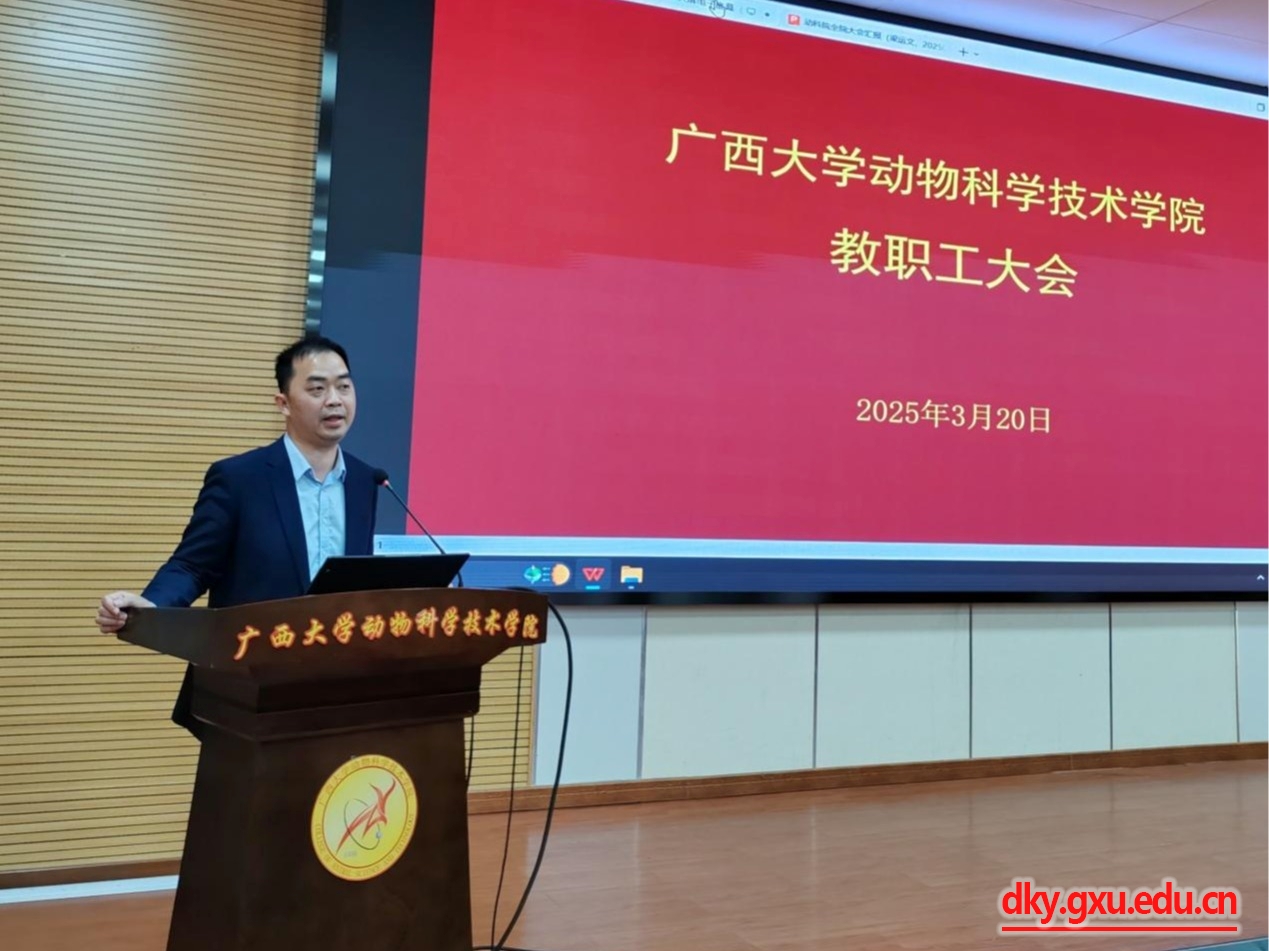 会上,院党委书记韦小强首先带领全院深入学习全国两会精神和《教育强国建设规划纲要(2024-2035年)》。强调学院各党支部要结合专业实际,以“三会一课”等形式组织师生党员认真学习贯彻。韦小强书记以《师德铸魂师风育人》为题,结合案例开展师德师风教育。他强调教师是立教之本、兴教之源,师德师风是教师队伍建设的灵魂,作为学生成长的引路人,教师的言行举止不仅影响着学生的学业发展,更深刻塑造着他们的价值观和人生品质,加强师德师风建设,是新时代教育高质量发展的必然要求,也是落实立德树人根本任务的重要保障。之后韦书记部署学院本学期党建与思想政治工作、“三业一稳”工作、推进农科大楼建设、动物医院运营、重大科研平台谋划、校友、助力乡村振兴、对外宣传等重点工作。最后,韦书记指出要强作风,聚合力,以“三拼精神”高质量推进学院各项工作。