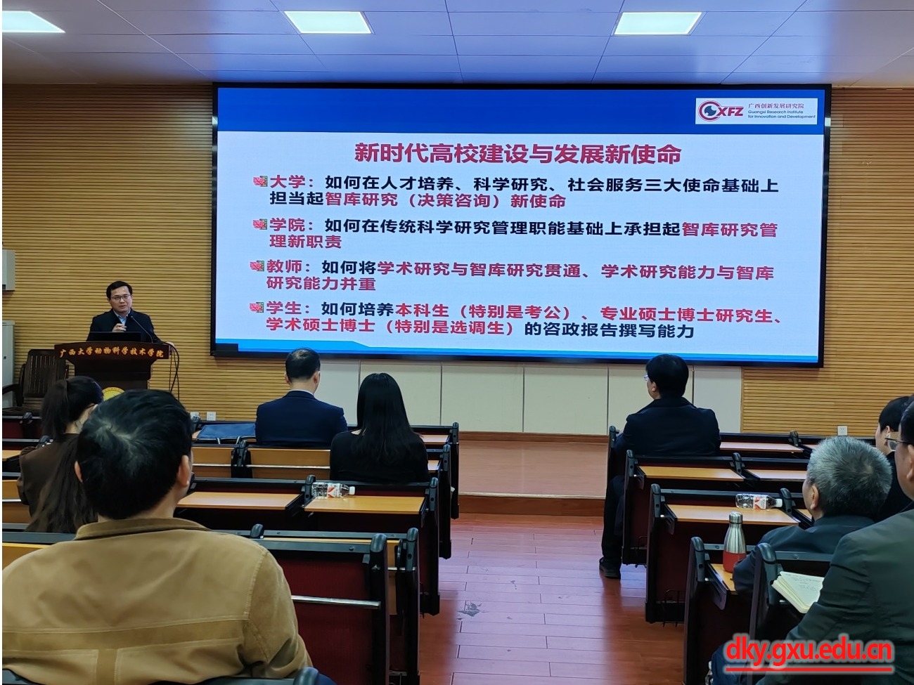 此次教职工大会还邀请了广西创新发展研究院院长梁运文作专题宣讲报告,梁运文院长以《广西创新发展研究院情况汇报》为题,首先从广西创新发展研究院成立的背景与初衷、职责使命等方面阐明了智库研究的重要性,接着介绍了智库成果报送的渠道,最后分享了开展智库研究的一些实践经验。本次报告会内容丰富、视野开阔、主题鲜明,威廉官网全体教职工获益匪浅。