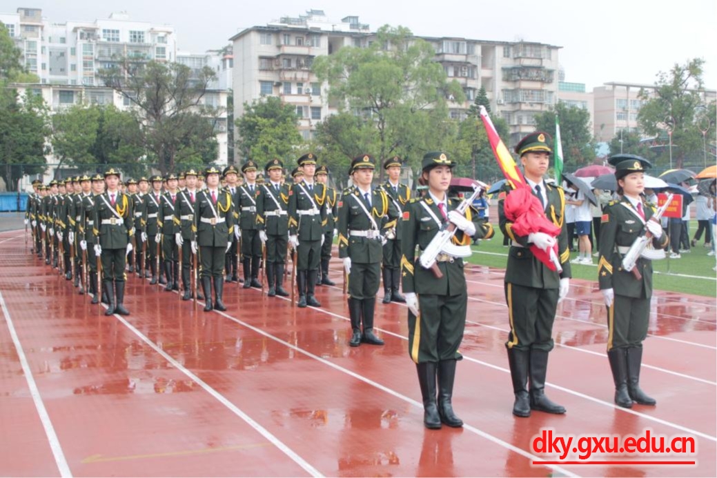在全场师生的注目下,英姿飒爽的国旗护卫队队员,迈着整齐划一、铿锵有力的步伐,护送鲜艳的五星红旗进场。“起来,不愿做奴隶的人们,把我们的血肉,筑成我们新的长城……”全场师生齐声高唱国歌,注视着鲜艳的五星红旗冉冉升起。
