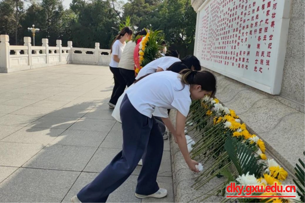 在南宁革命烈士纪念碑前,全体师生庄严肃穆、整齐列队。“我们要以先烈们为榜样,学习他们坚定的理想信念、无私的奉献精神、顽强的拼搏精神。”辅导员马朝阳带领大家回顾革命先辈的丰功伟绩,并勉励大家不忘初心,牢记新时代大学生的使命和担当。师生们通过集体默哀、敬献花圈和手工制作的白花、瞻仰纪念碑等方式,表达对英烈的深切哀思。