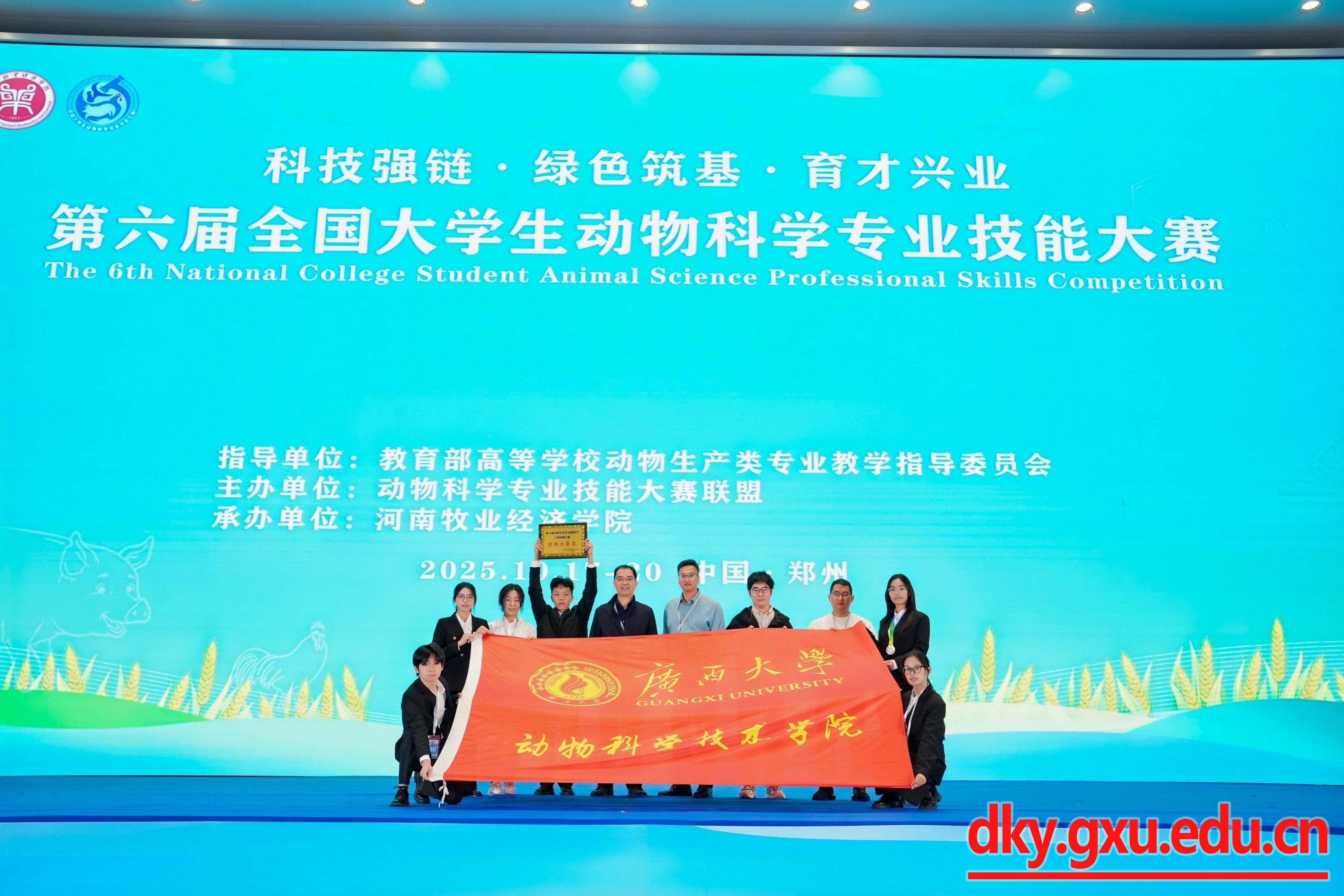 10月17日-19日,由全国动物科学专业技能大赛联盟主办的“第六届全国大学生动物科学技能大赛”在河南牧业经济学院举行,来自全国73所涉农本科高校的参赛队伍同台竞技。由威廉官网中国官方网站院长陆阳清,副院长蒋钦杨带队,黄艳娜、许惠艳、刘兴廷、梁晶、孔志伟和马杰等老师指导,动物科学专业黄好婷、刘亦婷、黎忠豪、谢晓玲、甘凯文等5名本科生组成的参赛队伍,经过紧张激烈的比赛,动科学院队获团体二等奖、项目一“生态畜牧场规划设计”单项一等奖。