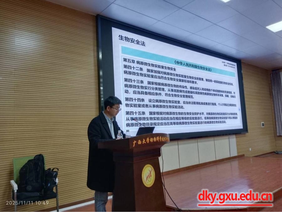 上午的生物安全培训由郭爱涛副院长主持,陆翔副处长到场并讲话,着重强调了实验室安全的重要性,尤其指出生物安全不仅关乎师生个人健康安全,更关乎公共卫生安全,全体实验人员须高度重视。