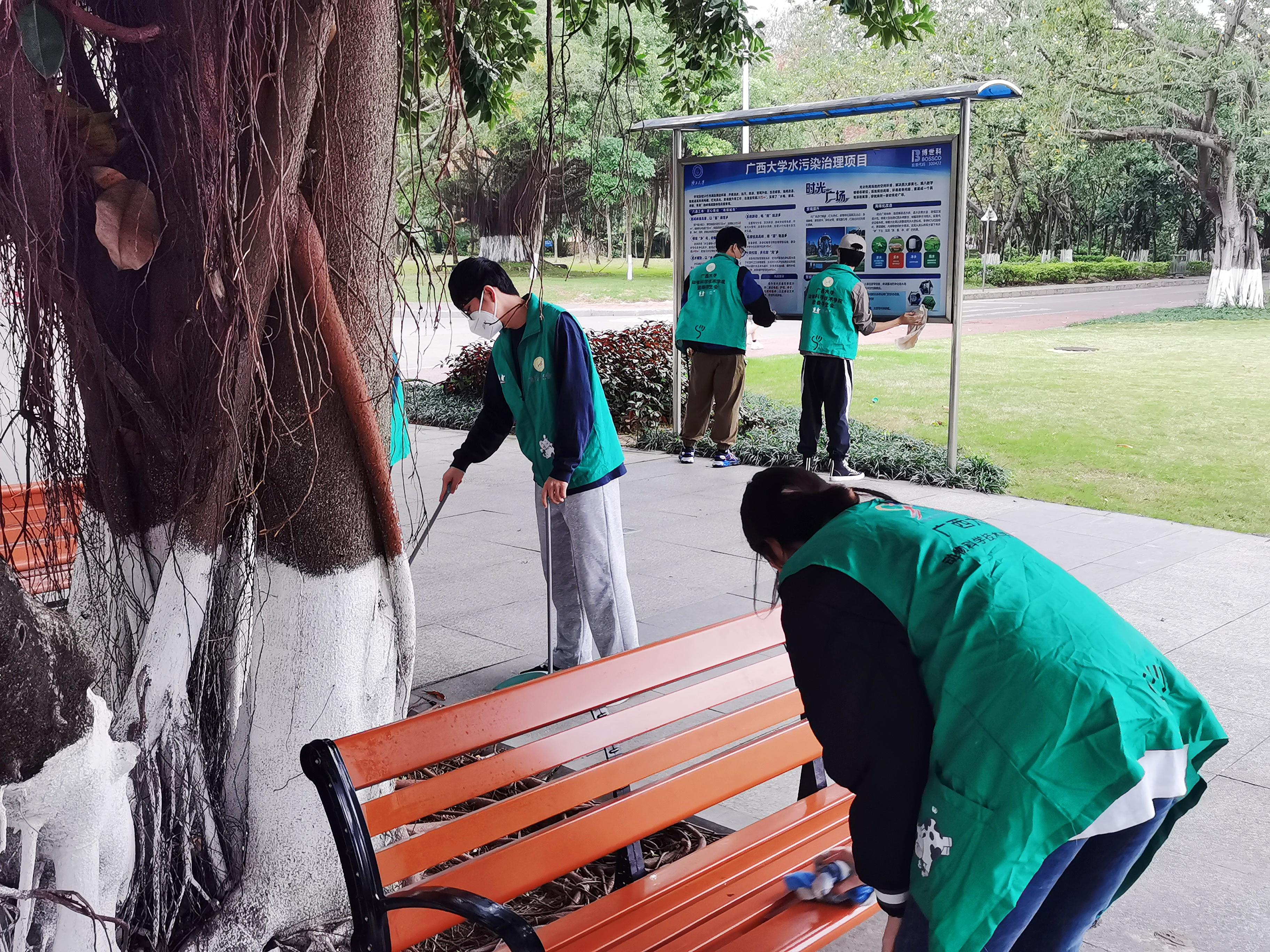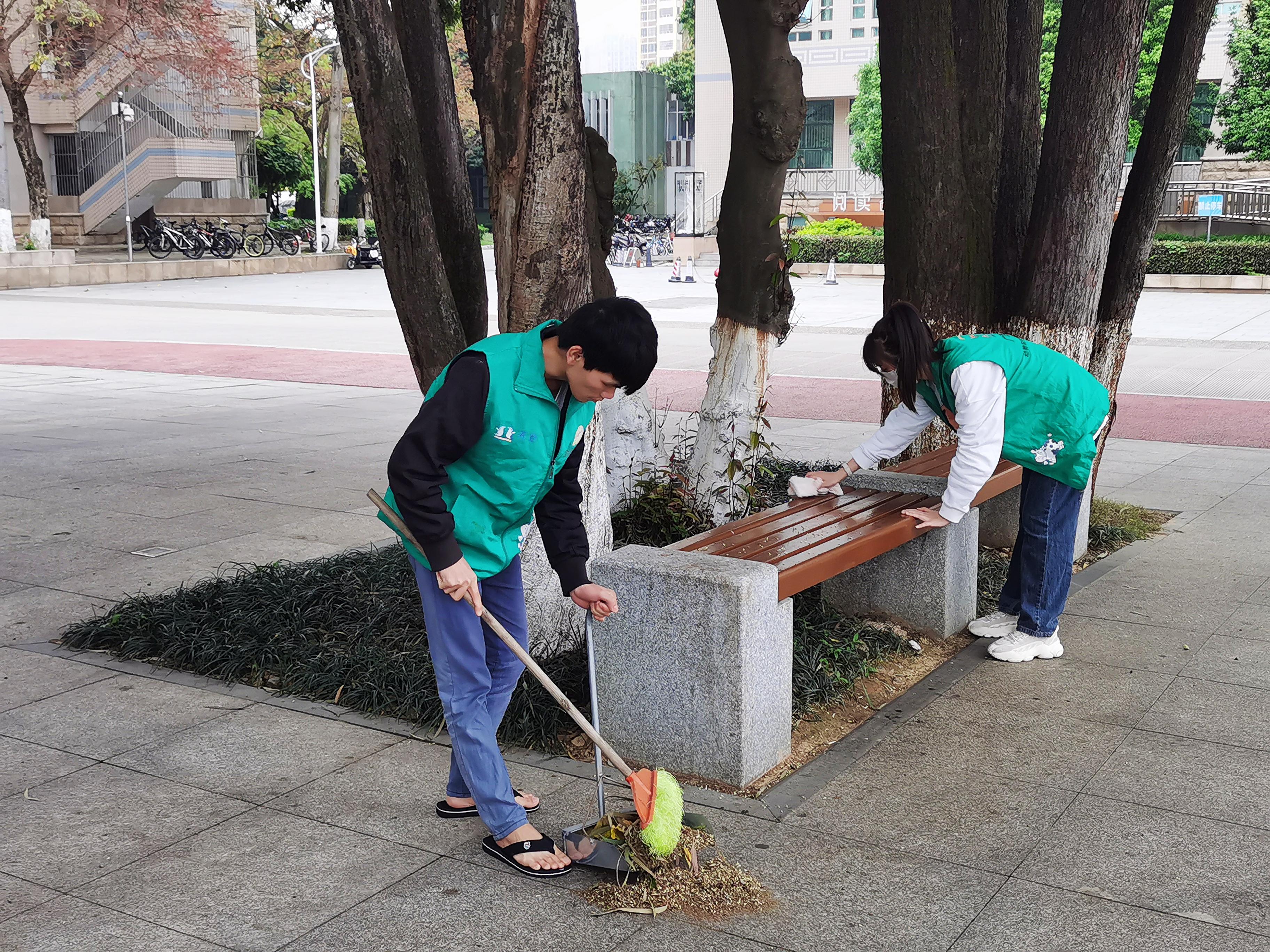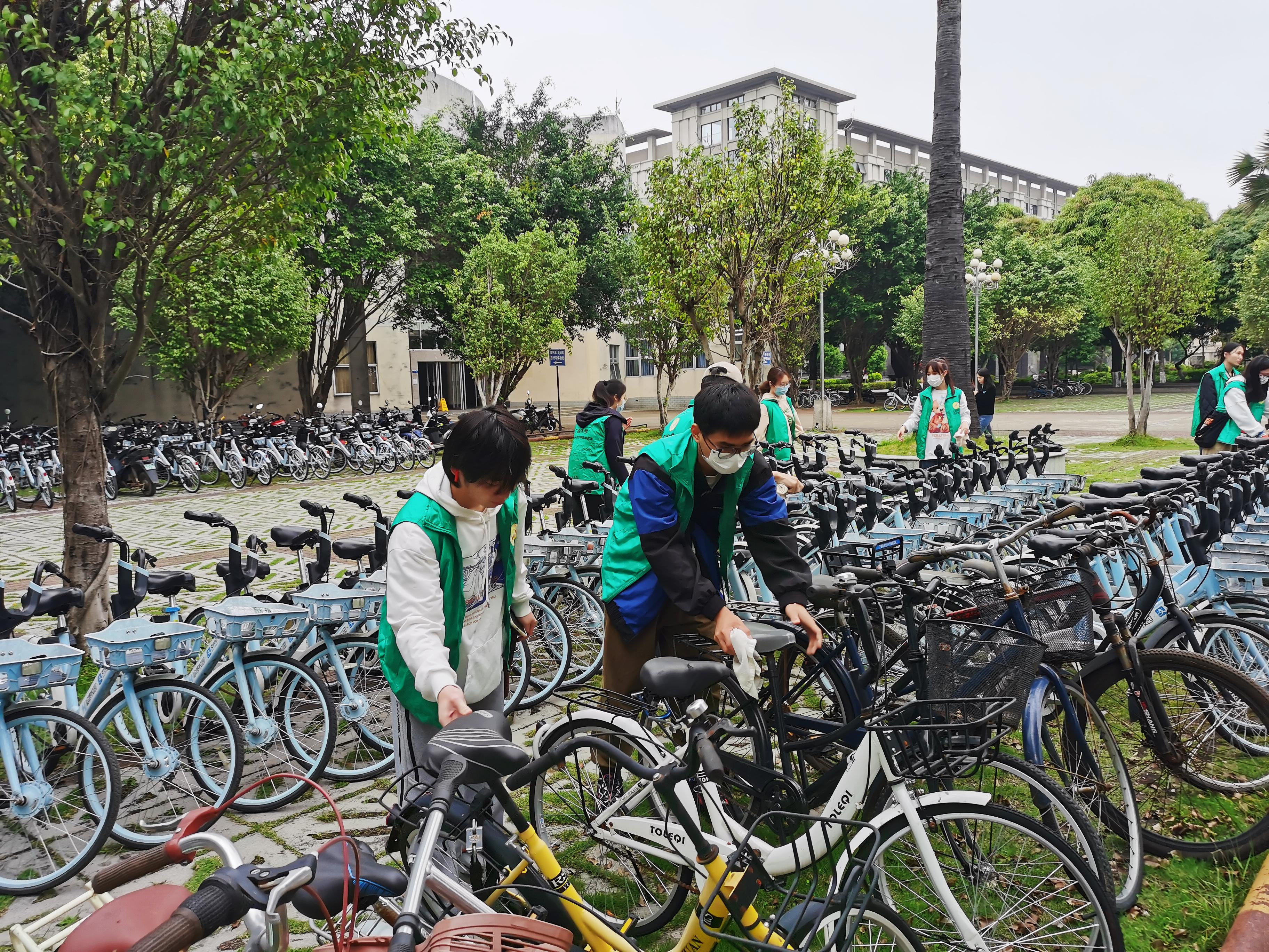 40余名志愿者身穿绿马甲,拿着抹布、扫帚等工具,分为多个小组在图书馆前坪、时光广场、第十教学楼前坪、第六教学楼前坪进行清扫。经过两个小时的辛勤劳动,整片区域焕然一新。干净的地面,整齐的单车,赢得了师生们的称赞和夸奖。