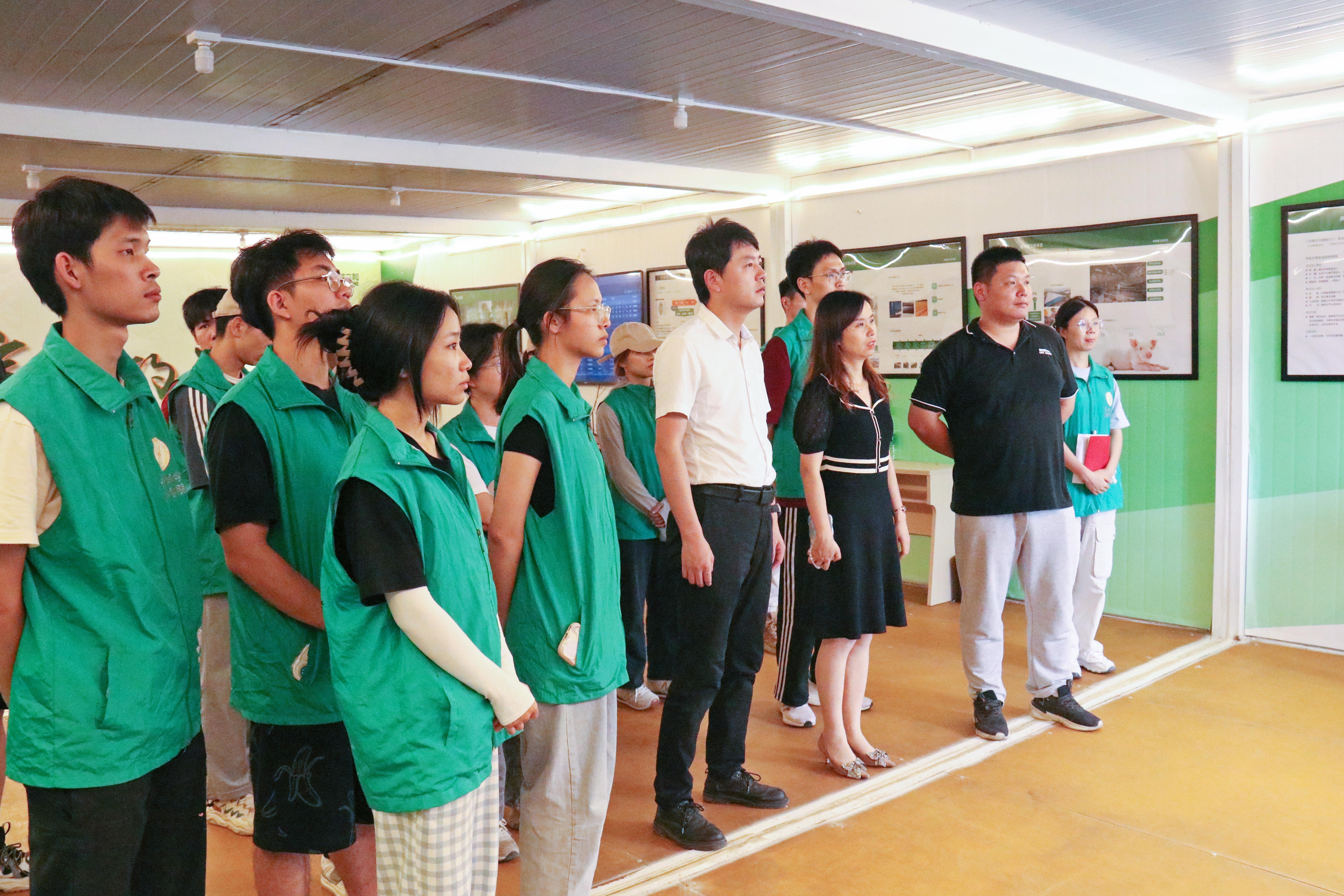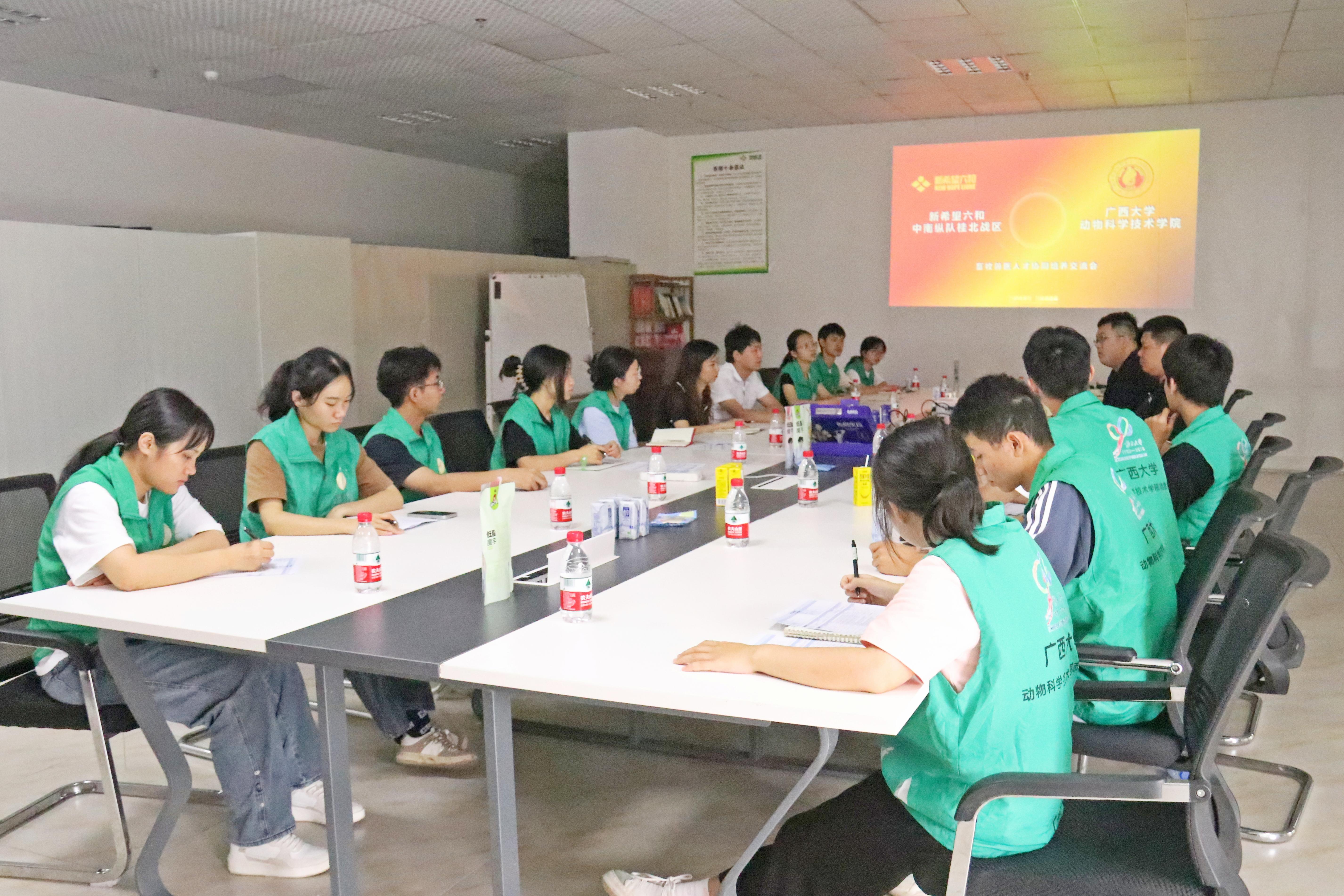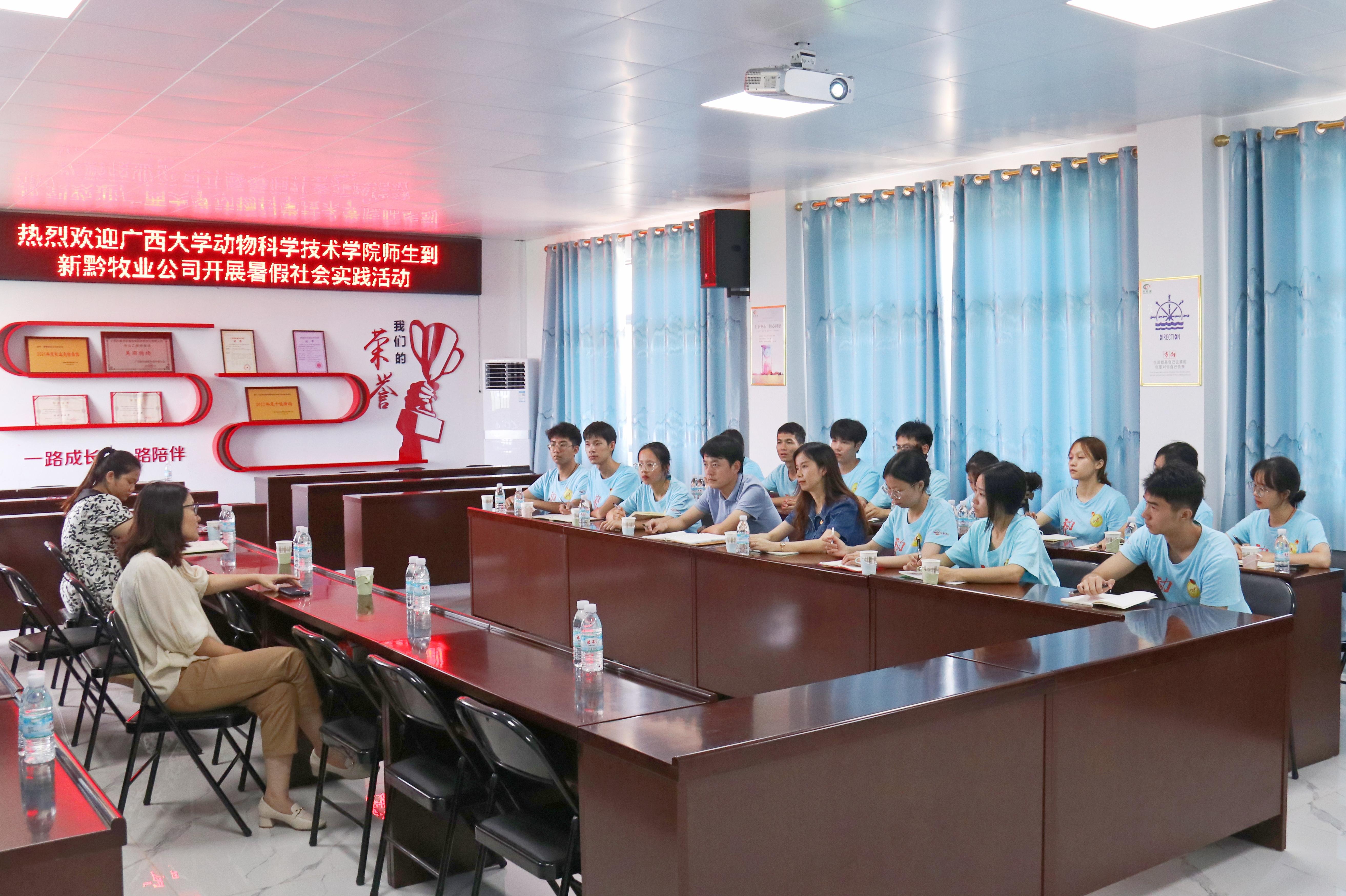 8日上午,实践团师生来到了广西农垦永新畜牧集团新黔牧业有限公司,通过图片展示、模型沙盘、监控视频等方式,全面了解了其发展历程、业务板块、疫病净化等情况,并就人才培养、产教融合、实习实践等方面与公司董事长苏丽娟以及校友代表进行了座谈交流。