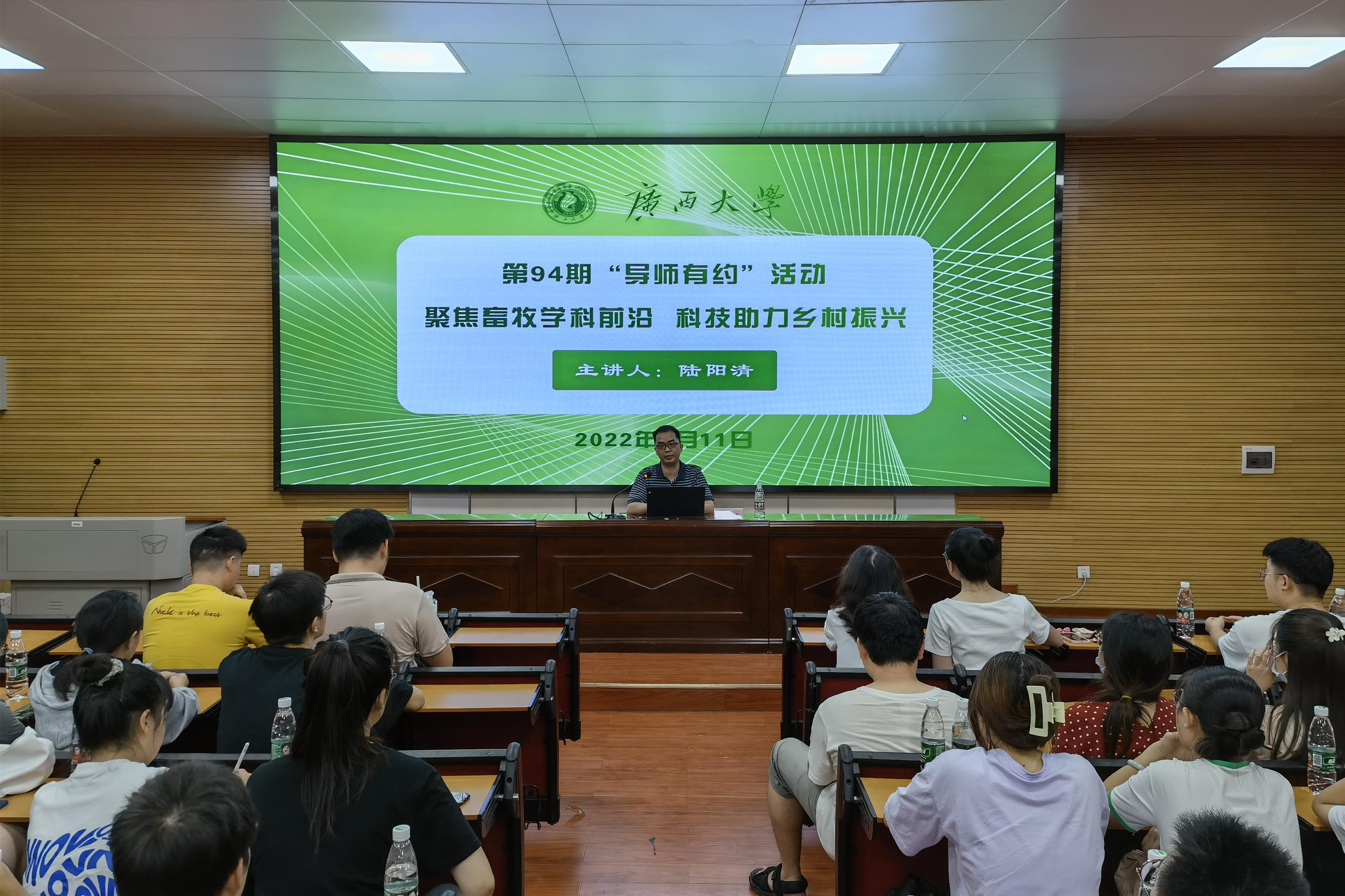 6月11日晚上,威廉官网中国官方网站第94期“导师有约”活动在威廉官网中国官方网站318报告厅举行,主题为“聚焦畜牧学科前沿,科技助力乡村振兴”,威廉官网中国官方网站常务副院长、教授、博士生导师陆阳清受邀主讲。威廉官网中国官方网站团委副书记刘诚,以及2021级畜牧学、畜牧专业全体硕士生参加此次活动。