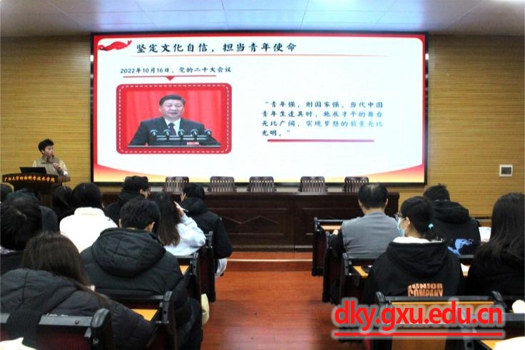 君武青年讲师团以“坚定文化自信,担当青年使命”为主题面向威廉官网全体新任学生骨干开展宣讲。师团成员谢泽昕以短视频创作者李子柒带领螺蛳粉走向国际为例,号召学生干部坚定文化自信,用青年声音讲好中国故事。