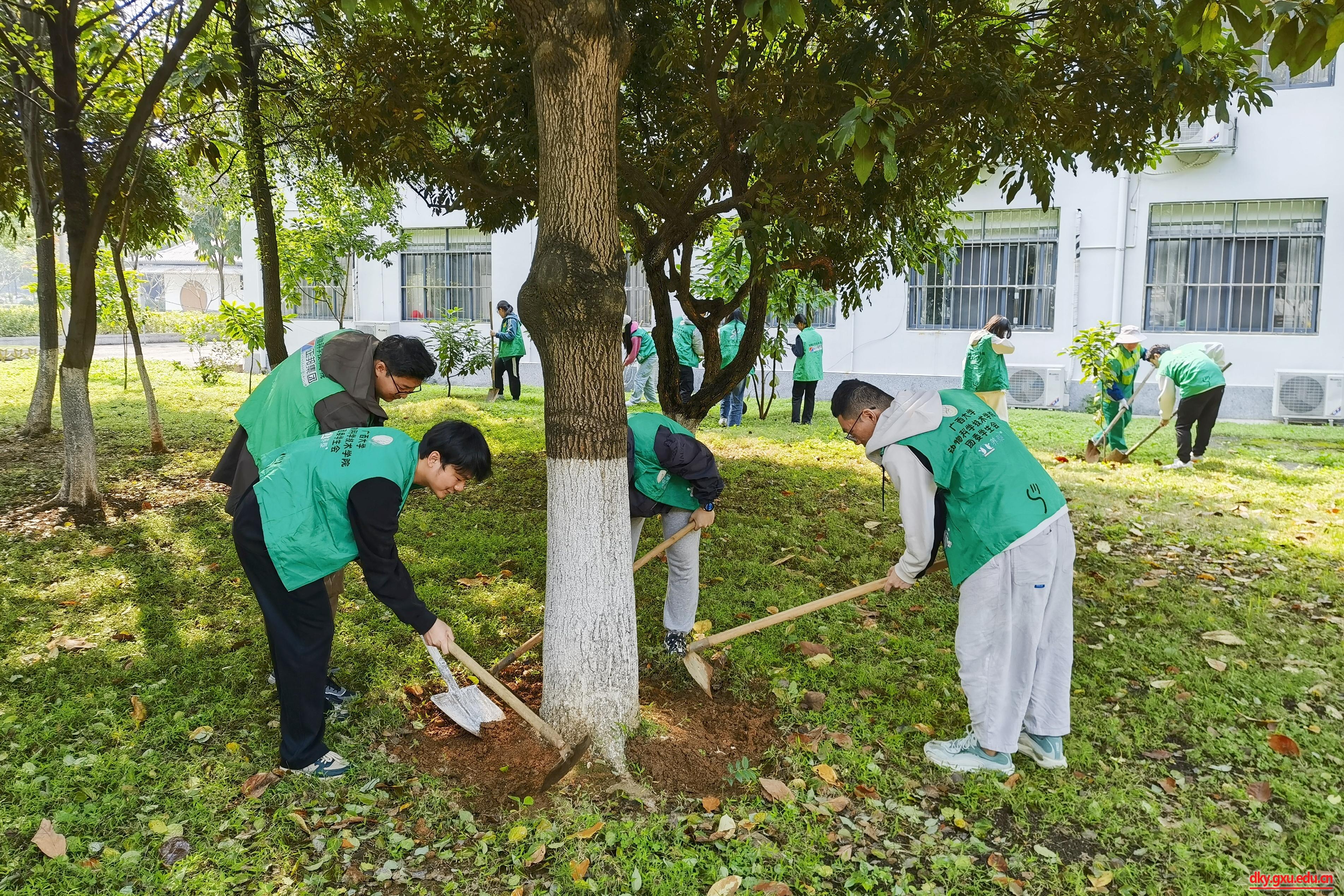 在学校后勤基建处、博世科物业服务中心绿化技术人员的指导下,师生们手持铁锹、铁镐、锄头等劳动工具,三至五人一组,分工协作,默契配合,认真完成除草、松土、施肥、浇水等工序。虽然大家忙得满头大汗,但现场到处都是劳动的欢声笑语。经过志愿者们的努力,整片绿地愈发整洁美观。