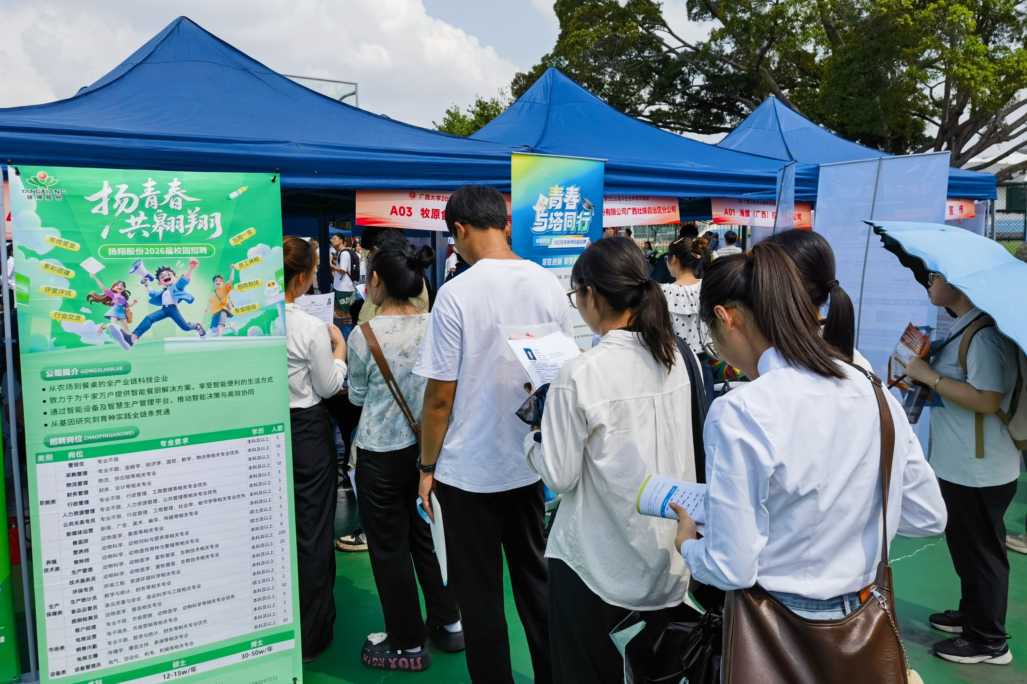 活动现场,同学们根据自身的实际需求和发展方向,穿梭于各个招聘展位之间,寻找心仪的用人单位,并与其就工作任务、薪资福利、晋升途径等方面进行深入沟通交流。本次双选会共有广西农垦、双胞胎集团、牧原集团、力源集团、大北农集团等来自全国各地的354家用人单位,提供生产管理、技术服务、产品研发、市场营销等1.7万个招聘岗位。