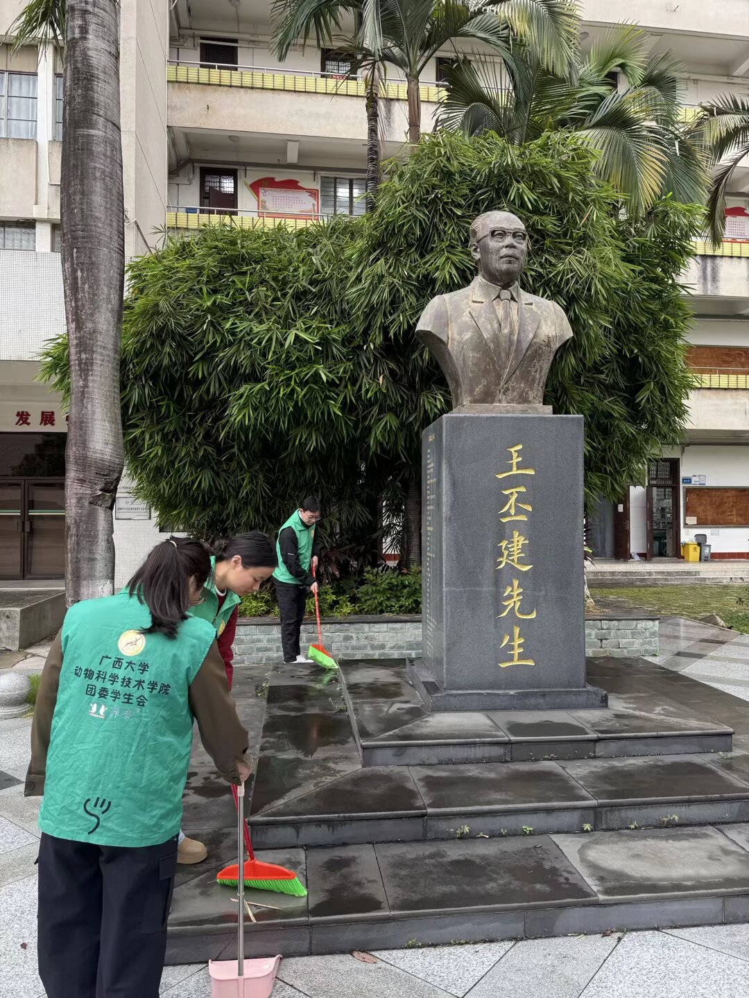 活动正式开始前,负责人向参与的志愿者们简要介绍了王丕建先生的生平事迹,让大家对这位为学校发展鞠躬尽瘁的先贤有了更深入的了解。同时,负责人还着重强调了活动注意事项,提醒大家在清扫过程中要轻拿轻放工具,避免对先生像及周边设施造成任何损坏,以表达对先贤的敬重。
