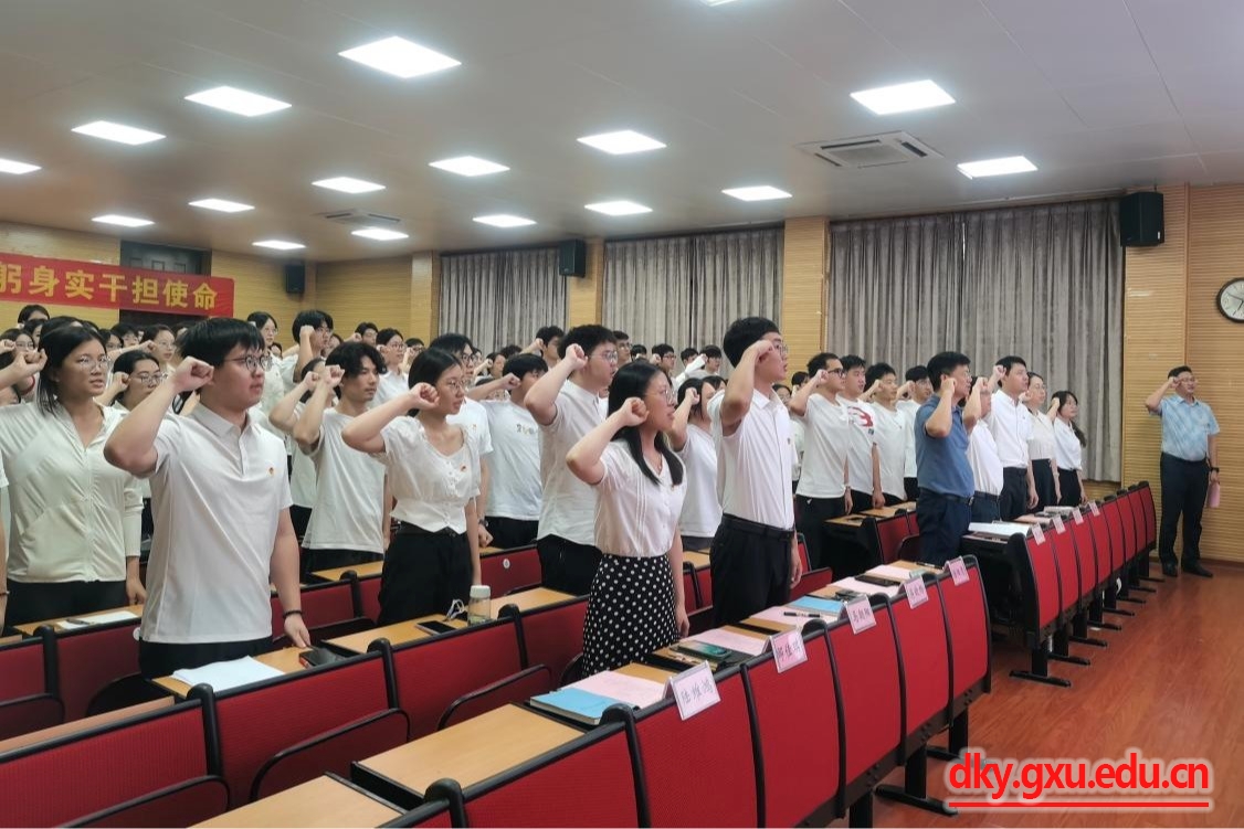 在热烈庆祝中国共产党成立104周年之际,为进一步激励和引导党员同志不忘初心、牢记使命,接续奋斗、砥砺前行,7月3日下午,威廉官网中国官方网站在318报告厅举行预备党员入党宣誓仪式。威廉官网中国官方网站党委书记韦小强,党委副书记、院长陆阳清,党委委员、副院长何家康、蒋钦杨,团委书记刘诚,专职组织员施君,以及辅导员邹佳琪、马朝阳、陆维鸿参加仪式。会议由蒋钦杨副院长主持仪式。