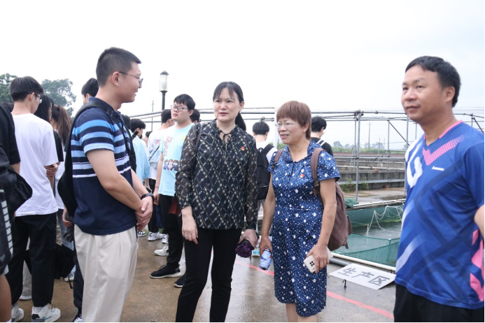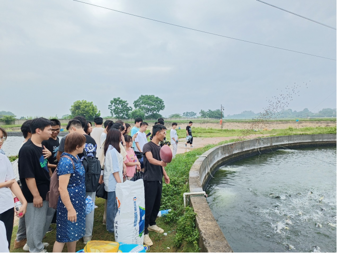 第三站,在广西水产引育种中心肖珊主任的带领下,师生们参观了水产引育种中心罗非鱼良种场,近距离感受种质资源库的丰富资源及其重要作用。参观时恰逢广西水产引育种中心支部委员会开展“学思想见行动 服务‘三农’勇担当”主题党日活动,师生们一起参与体验测量鱼体指标、鱼苗打包、撒网捕鱼等项目,并参与水产引育种中心支部委员会座谈会,深入学习领会习近平新时代中国特色社会主义思想。