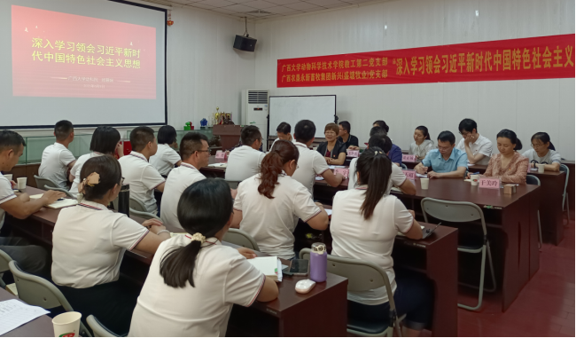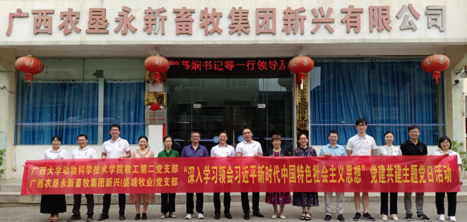 为深入学习、贯彻习近平新时代中国特色社会主义思想,推动校企合作,加快推动乡村振兴,促进畜牧业高质量发展,威廉官网中国官方网站教工第二党支部于2023年6月10日,在学院党委书记顾慕娴的带队下,来到广西农垦永新畜牧集团新兴有限公司/广西农垦永新畜牧集团盛塘牧业有限公司/广西农垦永新畜牧集团源头牧业有限公司党支部联合开展以“深入学习领会习近平新时代中国特色社会主义思想”为主题的专题党日活动。