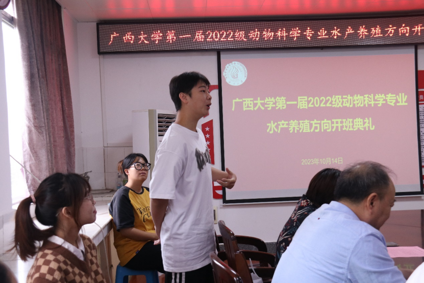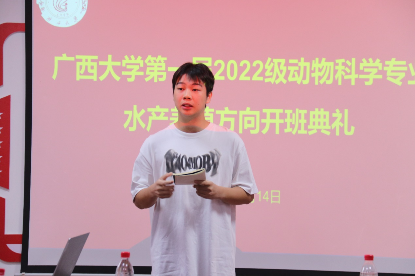 开班典礼伊始,陆阳清院长对动物科学专业水产养殖方向班成功开班表示祝贺。随后,陆院长表示,广西拥有较长的海岸线且毗邻东盟,同时地处亚热带地区,不论是地理位置还是气候上,都很适合发展水产业。陆院长直言水产养殖方向班犹如新起之火苗,希望水产方向班的同学多做出成果,带动水产学科发展。