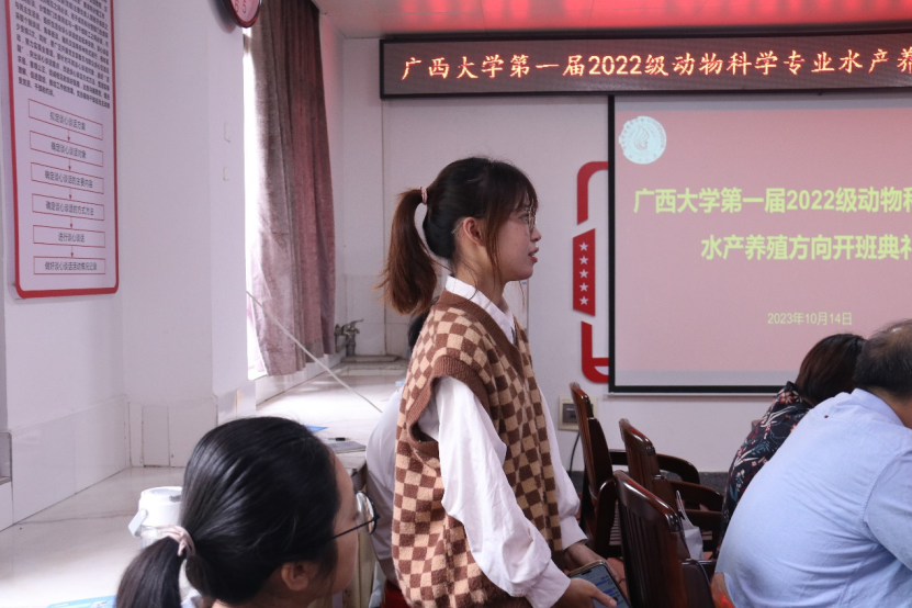 接着,该班学生代表唐玉图及颜畅发言。唐玉图同学表示对水产热爱已久,并坚定地选择了水产养殖方向班,在未来的日子里,会努力学习,为水产行业做贡献。颜畅同学则表示自己家住防城港海边,对水产常怀亲切之情,课堂上老师理论联系实际的教学方式也十分吸引她,在将来也会做出更大的努力,认真地投入学习。