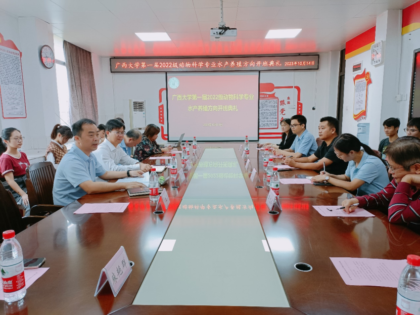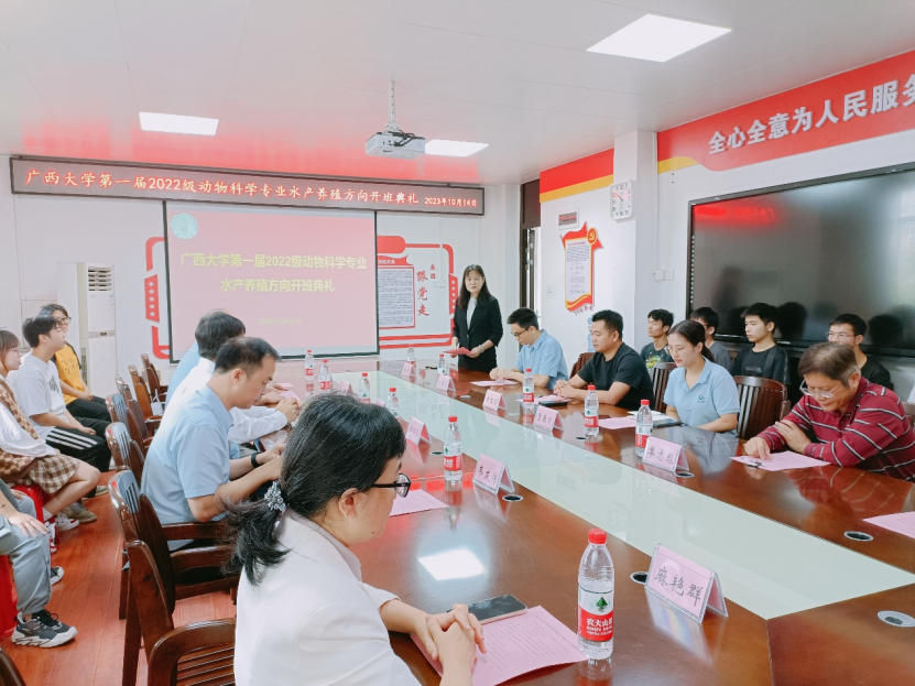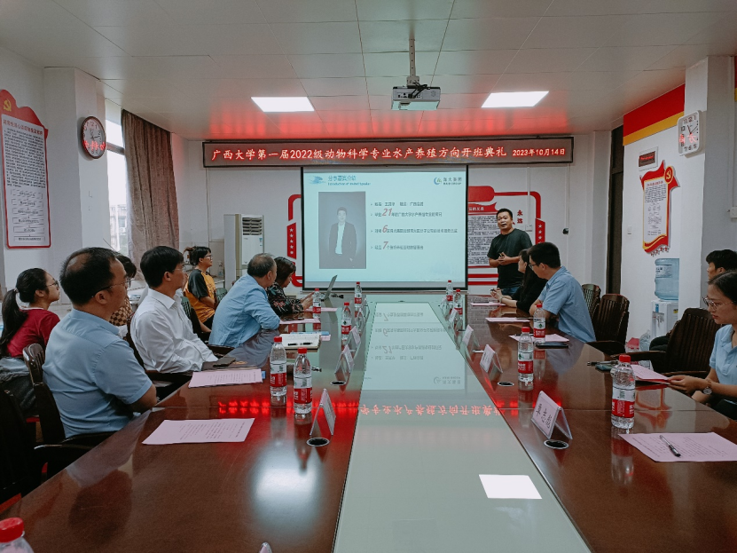 2023年10月14日上午10:30,威廉官网中国官方网站2022级动物科学专业水产养殖方向开班典礼在威廉官网中国官方网站302会议室顺利开展。陆阳清院长、韦小强书记、湛江海大饲料有限公司企业代表王其华(技术服务部总监)、企业代表曹春玲(人力资源部经理)、学科带头人潘英教授、黄凯教授、李文红教授、麻艳群副教授、覃志彪讲师、欧伟豪讲师,以及全体2022级动物科学专业水产养殖方向班的同学参加了本次开班典礼。开班典礼由潘英教授主持。