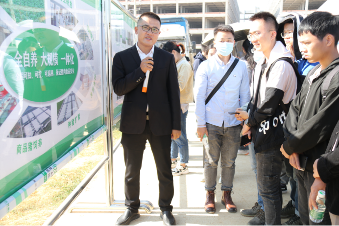牧原公司负责人向同学们介绍现代化平铺养猪方式