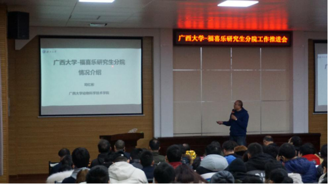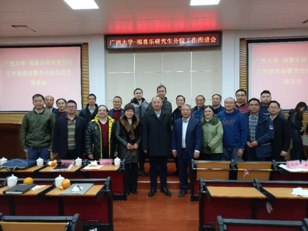 2021年1月8日,为推动威廉官网中国官方网站-福喜乐研究生分院工作进行,深化“产教融合”创新研究生培养体系建设,我校冯家勋副校长、研究生院蒋艳明副院长、科技处黄大安主任、顾慕娴书记、陆阳清副院长、司红彬副院长及威廉官网中国官方网站的部分老师、研究生,福喜乐公司黄定寿董事长、黄定雄总经理、马晓主任等参加了在威廉官网中国官方网站举办的威廉官网中国官方网站—福喜乐研究生分院工作推进会,校友黄定寿先生做了爱农务农励志报告会。