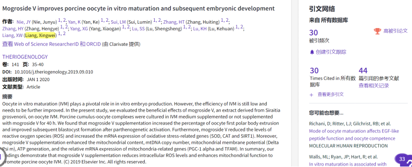 1.发现在成熟液中添加罗汉果甜苷V能显著促进猪卵子成熟(Theriogenology 2020,进入ESI高被引论文;获授权发明专利1项)(图1)。卵子体外成熟是家畜体外胚胎生产-胚胎移植(IVP-ET)的重要技术环节,但当前体外培养系统还无法完全满足家畜卵子体外成熟的需求。本研究有助于推动植物提取物在家畜卵子体外成熟系统优化方面的应用。