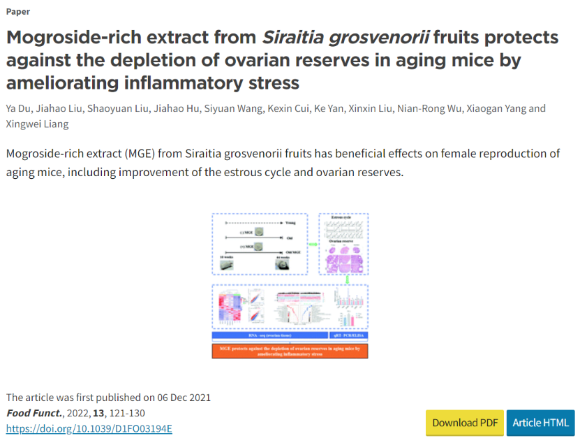 1. Du Y, Liu J, Liu S, Hu J, Wang S, Cui K, Yan K, Liu X, Wu N-R, Yang X, and Liang X. Mogroside-rich extract from Siraitia grosvenorii fruits protects against the depletion of ovarian reserves in aging mice by ameliorating inflammatory stress. Food and Function 2022;9:121-130.