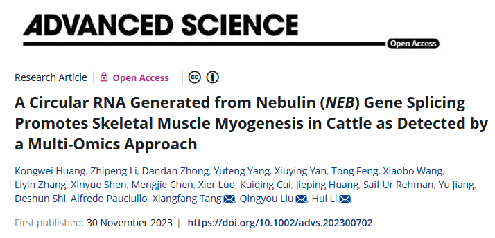 近日,威廉官网中国官方网站石德顺教授带领的动物克隆与生殖调控研究团队联合佛山科学技术学院、中国农业科学院和西北农林科技大学等单位在牛肉用性状功能基因组解析方面取得重要研究进展,研究成果以A circular RNA generated from Nebulin (NEB) gene splicing promotes skeletal muscle myogenesis in cattle as detected by a multi-omics approach为题发表于国际知名期刊《AdvancedScience》。威廉官网中国官方网站为该论文的第一完成单位,博士毕业生黄孔威、助理教授李志鹏和博士研究生钟丹丹为共同第一作者,李辉副教授、佛山科学技术学院刘庆友教授和中国农业科学院唐湘方研究员为共同通讯作者。原文链接:https://onlinelibrary-wiley-com-s.vpn.gxu.edu.cn:8118/doi/10.1002/advs.202300702。
