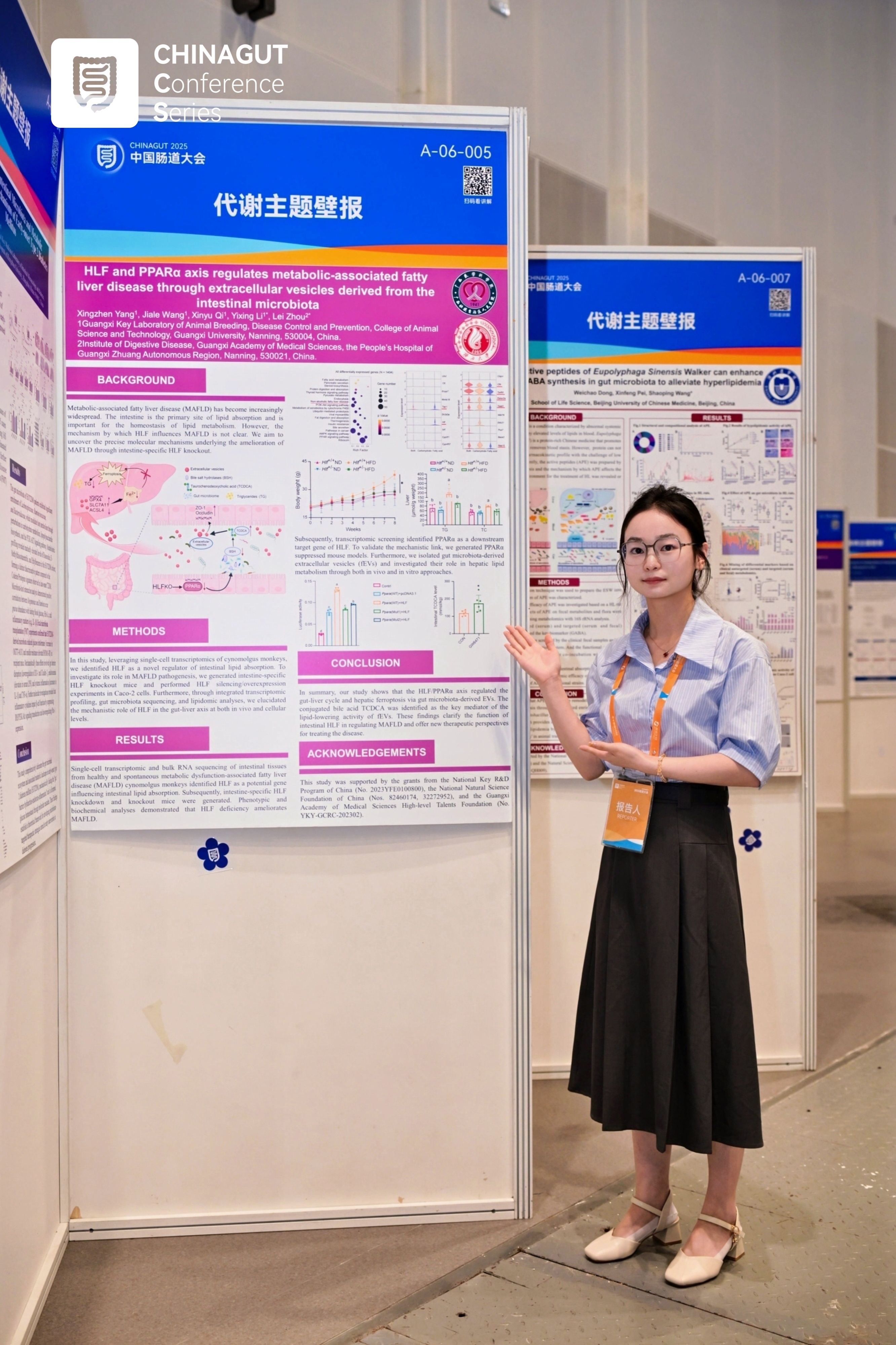 口头报告和壁报题目:HLF and PPARαaxis regulates metabolic-associated fatty liver disease through extracellular vesicles derived from the intestinal microbiota(已发表,中国科学院一区TOP SCI,IF:23.8,实时IF:35)。
