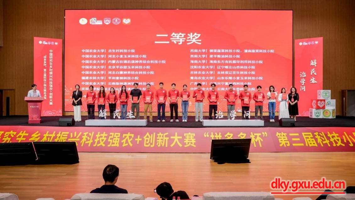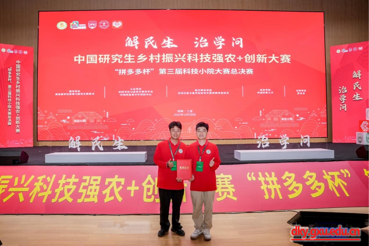 经过角逐,威廉官网中国官方网站研究生陈振霖、张浪组成的广西兴宁富凤鸡科技小院参赛团队荣获全国二等奖,团队指导教师陆阳清教授获优秀指导教师奖(该项目获得威廉官网中国官方网站研究生倍增计划项目和广西科技小院的支持)。
