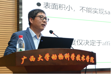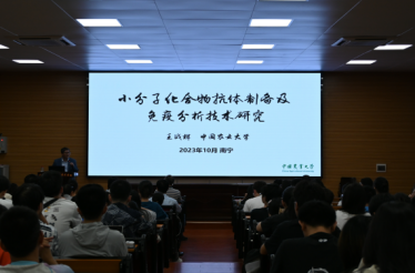 报告伊始,王战辉教授先介绍了中国农业大学兽医学系的概况和研究内容,并侧重介绍了其在快速检测方面的研究进展。随后,王战辉教授讲述了小分子化合物快速检测的背景、研究意义和目前存在的问题,并提出了“抗体是小分子化合物快检性能的决定性因素”。随后,王战辉教授就如何提升快速检测性能,从“半抗原理性设计合成”、“单克隆抗体发现及进化”、“免疫检测新技术及产品开发”、“抗体分子识别机制的研究”四个方面,深入浅出地向与会师生们介绍了相关领域内前沿技术的研究进展、技术难点、未来研究方向等。让师生们对小分子化合物快速检测领域有了更深入的了解,开拓了同学们的学术视野,增强了同学们的学术素养。