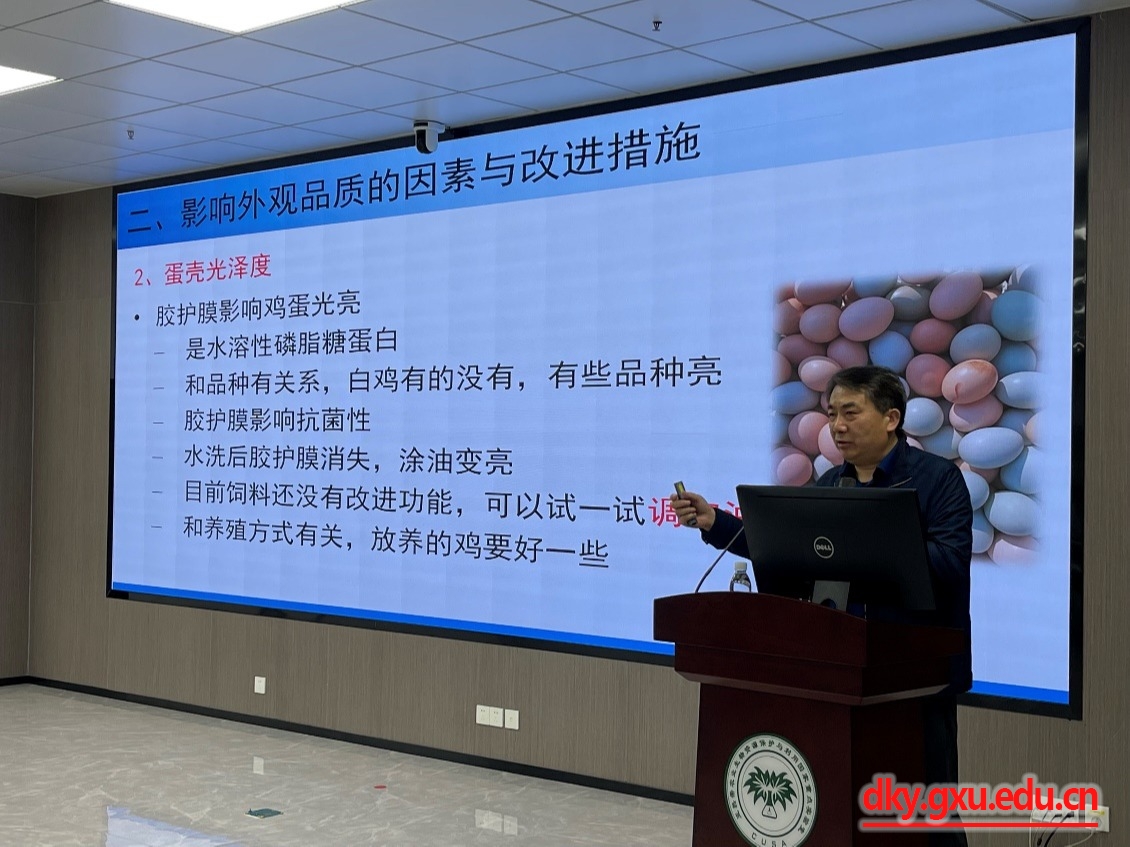 1月15日上午,中国农业大学宁中华教授应邀来威廉官网中国官方网站作题为“健康养殖提高鸡蛋品质增加养鸡效益”的学术报告。报告会由威廉官网中国官方网站院长陆阳清教授主持,100余名师生到场学习聆听报告。