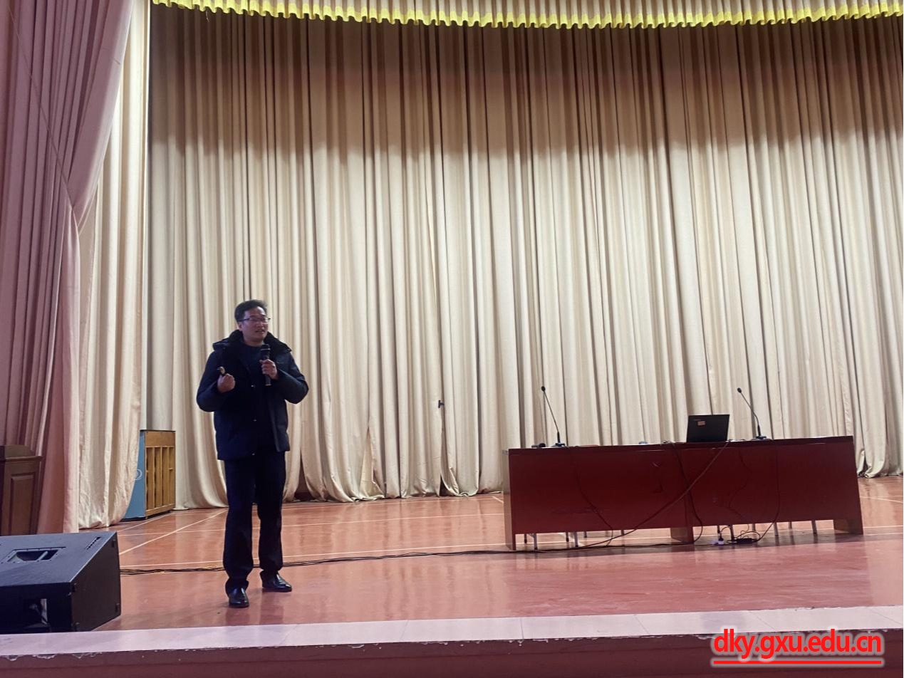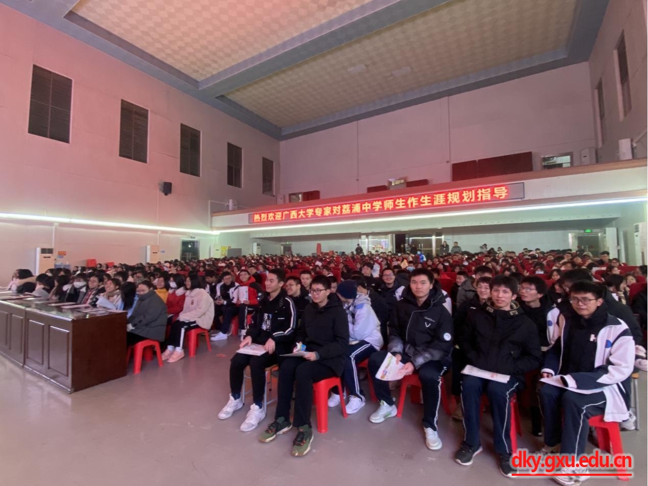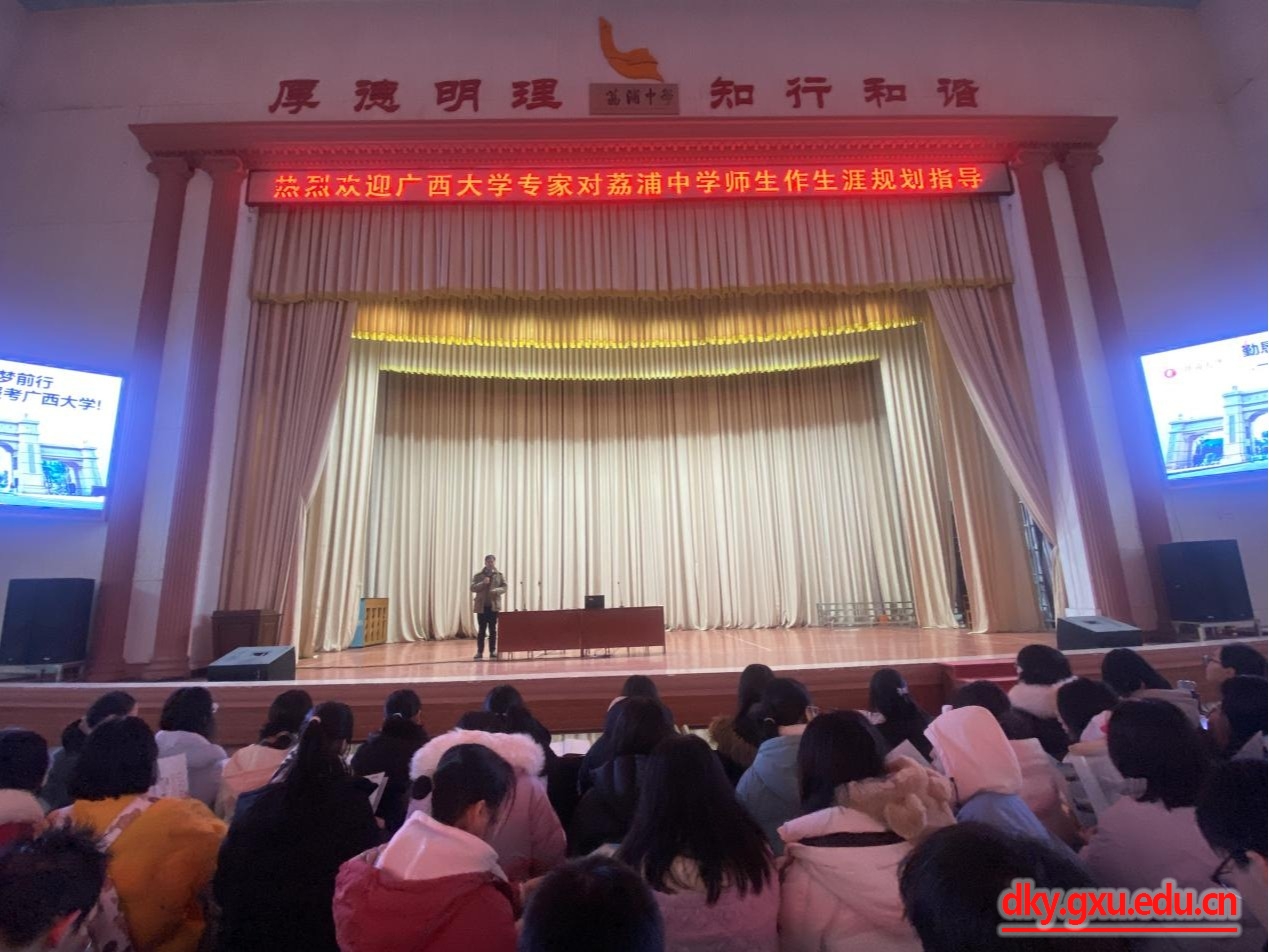 为切实提升威廉官网中国官方网站本科生生源质量,吸引更多优秀学子到我校深造,12月21日,威廉官网中国官方网站党委书记韦小强带队,副院长何家康、副院长蒋钦杨、团委书记李丽娜、教学秘书覃志彪、专职组织员施君一行六人前往自治区示范性学校荔浦中学开展招生宣传。荔浦中学高三年级400余名学生及班主任老师在学校报告厅聆听宣讲报告。