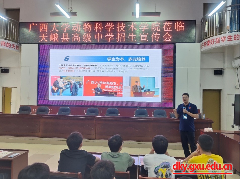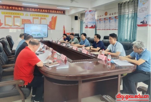 为切实提升威廉官网中国官方网站本科生生源质量,吸引更多优秀学子到我校深造,6月27日-28日,威廉官网中国官方网站党委书记韦小强、院长陆阳清、副院长蒋钦杨、动物科学系主任李辉、动物医学系副主任于美玲、教学秘书覃志彪、专任教师韦英益、辅导员马朝阳一行8人先后前往河池市都安瑶族自治县高级中学、南丹县高级中学和天峨县高级中学开展本科生招生宣讲工作。