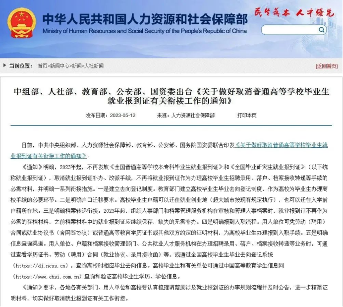 日前,中共中央组织部、人力资源社会保障部、教育部、公安部、国务院国资委发布《关于做好取消普通高等学校毕业生就业报到证有关衔接工作的通知》,明确自2023年起,不再发放《全国普通高等学校本专科毕业生就业报到证》和《全国毕业研究生就业报到证》,取消就业报到证补办、改派手续,不再将就业报到证作为办理高校毕业生招聘录用、落户、档案接收转递等手续的必需材料。通知明确了一系列衔接措施。