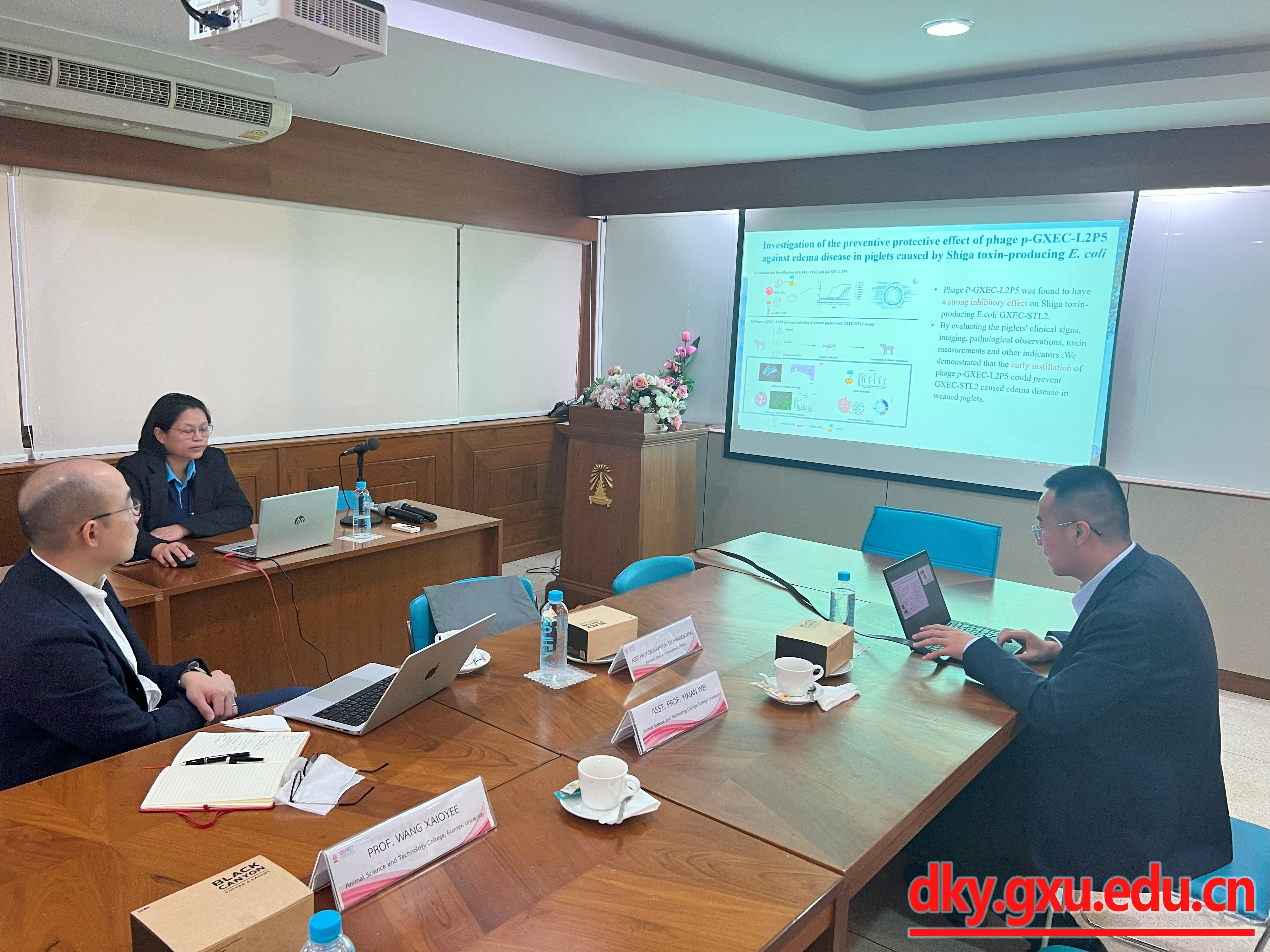 On July 1, Associate Professor Wang Xiaoye and Teacher Wei Yixian from the College of Animal Science and Technology led students Huang Lirou, Li Lixuan and Hu Jiamin to Chulalongkorn University in Thailand for a three-month small animal clinical diagnosis and treatment internship. In addition, Associate Professor Wang Xiaoye and Teacher Wei Yixian also communicated and discussed with relevant staff from Chulalongkorn University, Kasetsart University and Prince of Songkla University in Thailand on issues such as future exchange internships, joint application for scientific research projects and promotion of academic exchange conferences.